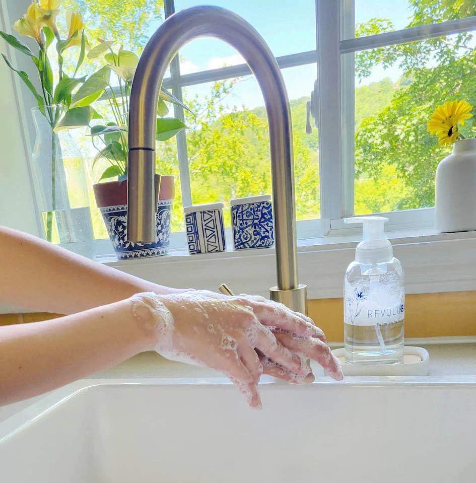 KIT SAVON À MAINS MOUSSANT : Versez 300 mL d’eau chaude dans le distributeur de savon mousse. Ajoutez une pastille de recharge et laissez-la se dissoudre complètement avant utilisation