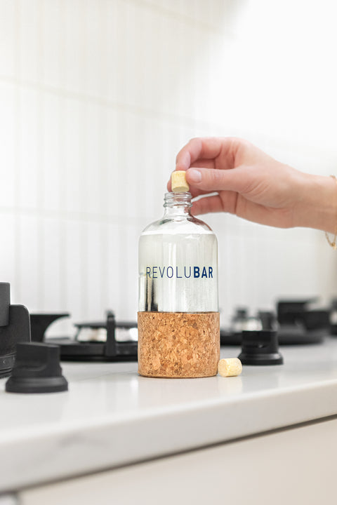 Chaque pastille REVOLUBAR est emballée dans un petit sachet compostable à base d’amidon de maïs. Une fois dissoute dans l’eau, elle procure 500 mL de nettoyant puissant dans sa bouteille en verre rechargeable encore et encore.